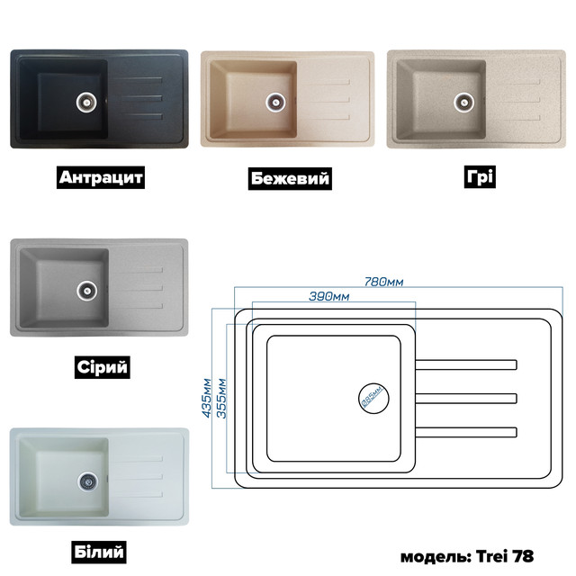 Гранітна кухонна мийка Romzha Trei 78. Врізна мийка на кухню, гранітні мийки, мийки на кухню